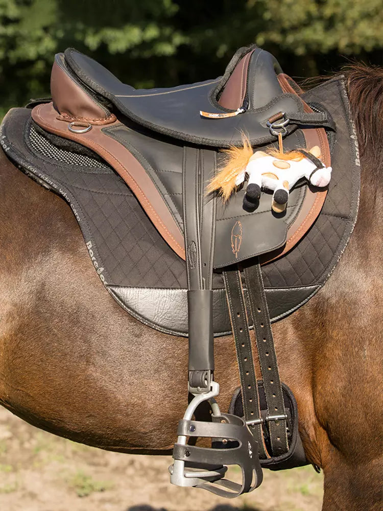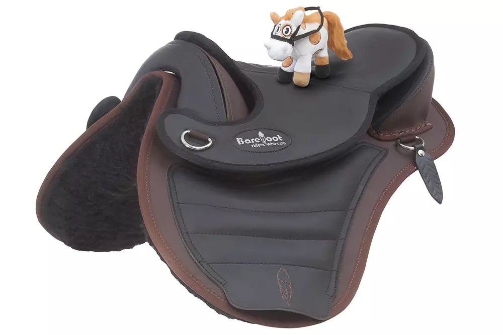 אוכף שאיין בארי עשוי דרייטקס בעיצוב מיוחד לילדים. משטח האוכף דוחה מים ובעל גימור נעים למגע - לשטיפה ותחזוקה קלה. האוכף כולל רפידות מימין ומשמאל לעמוד השדרה של הסוס להגנה מירבית וממקם את הרוכב הצעיר בתנוחה בטוחה ויציבה מעל הסוס. מכיוון שבאוכף Barefoot הרוכב מרגיש כל תנועה של הסוס, רוכבים מתחילים לומדים כיצד לתקשר עם הסוס ולפתח ישיבה חופשית במהירות.